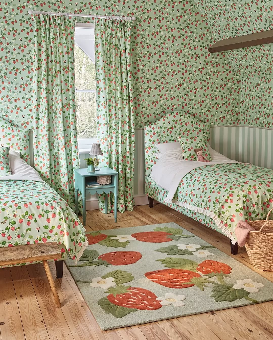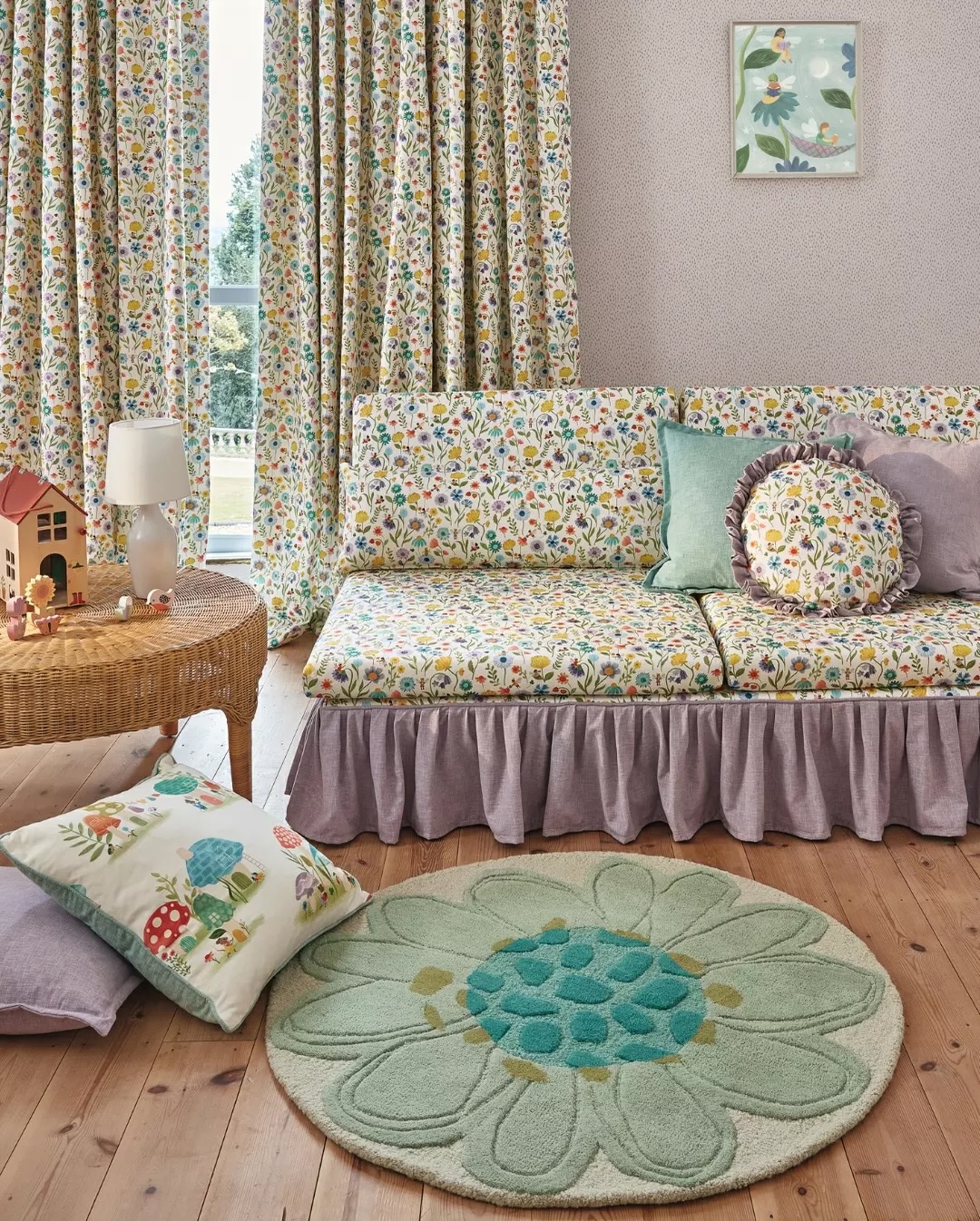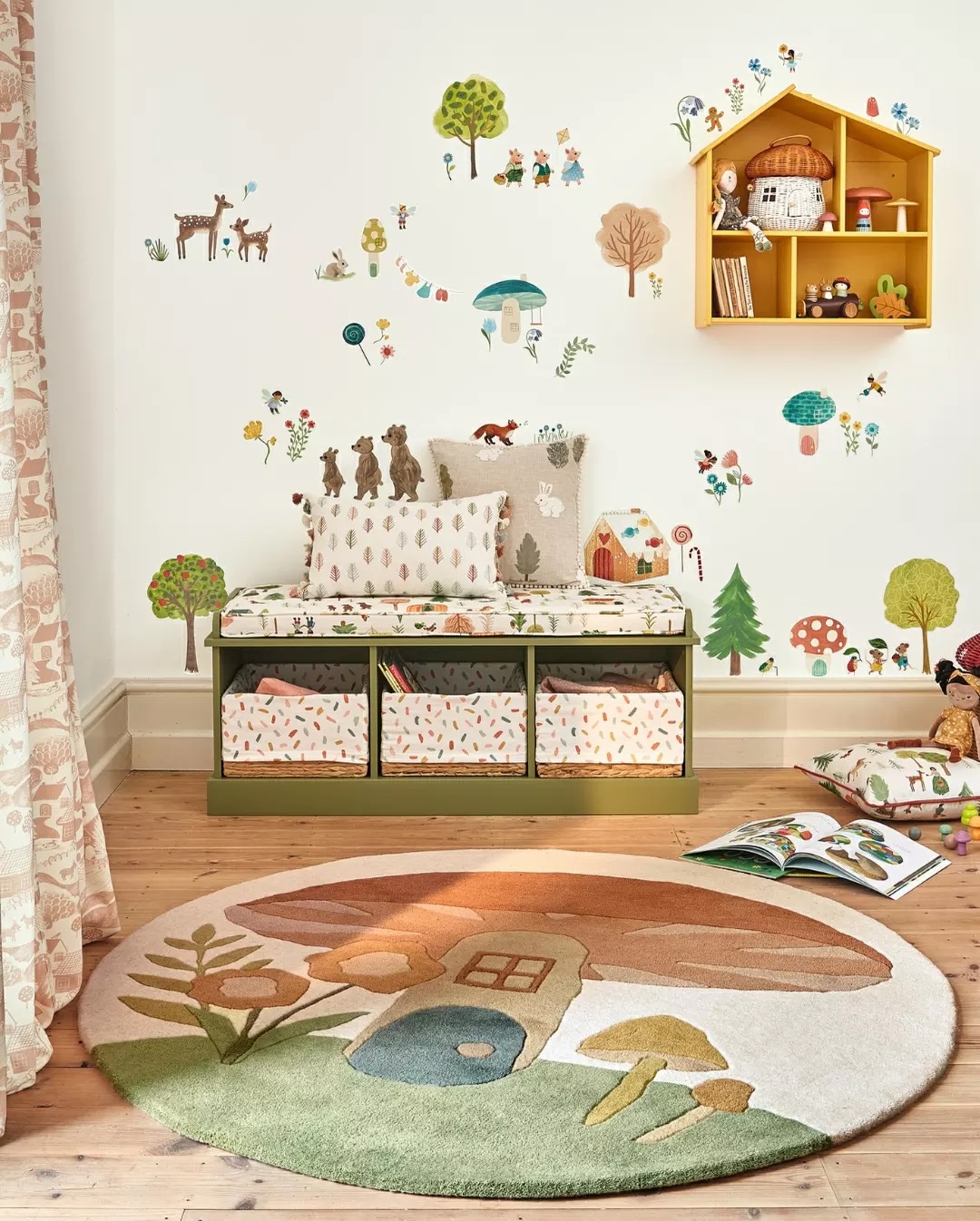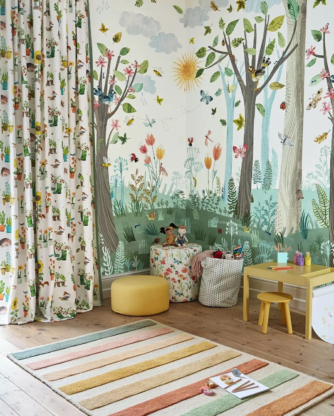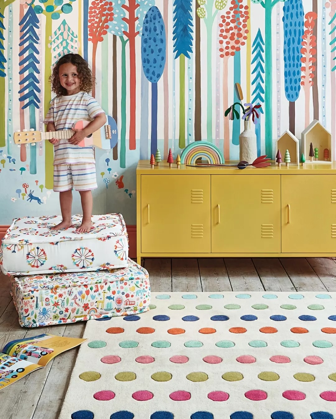 Колекція від англійського бренду VILLA NOVA Picturebook II rugs - килими, створені за ілюстраціями Frann Preston-Gannon, Christopher Corr та Yuval Zommer. Вони переносять у світ дитячих книжок, пригод і фантазій. Килими поєднуються зі шпалерами та текстилем цієї ж колекції, тому дитяча кімната може виглядати як цілісний простір. Від нічного неба до лісових історій чи веселих барвистих світів.