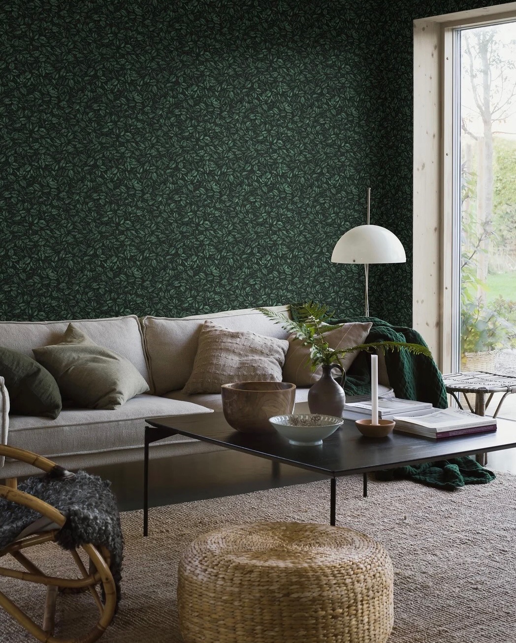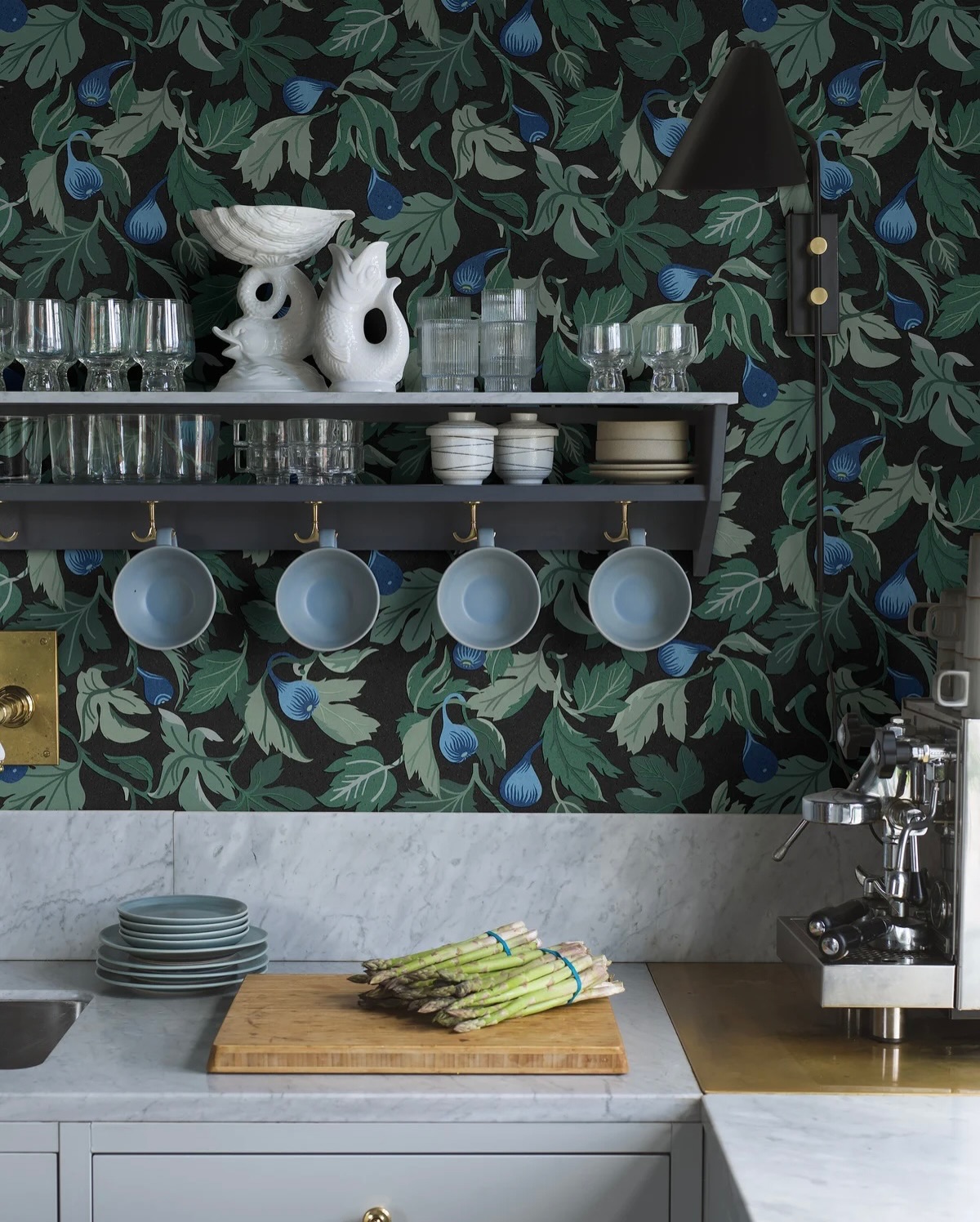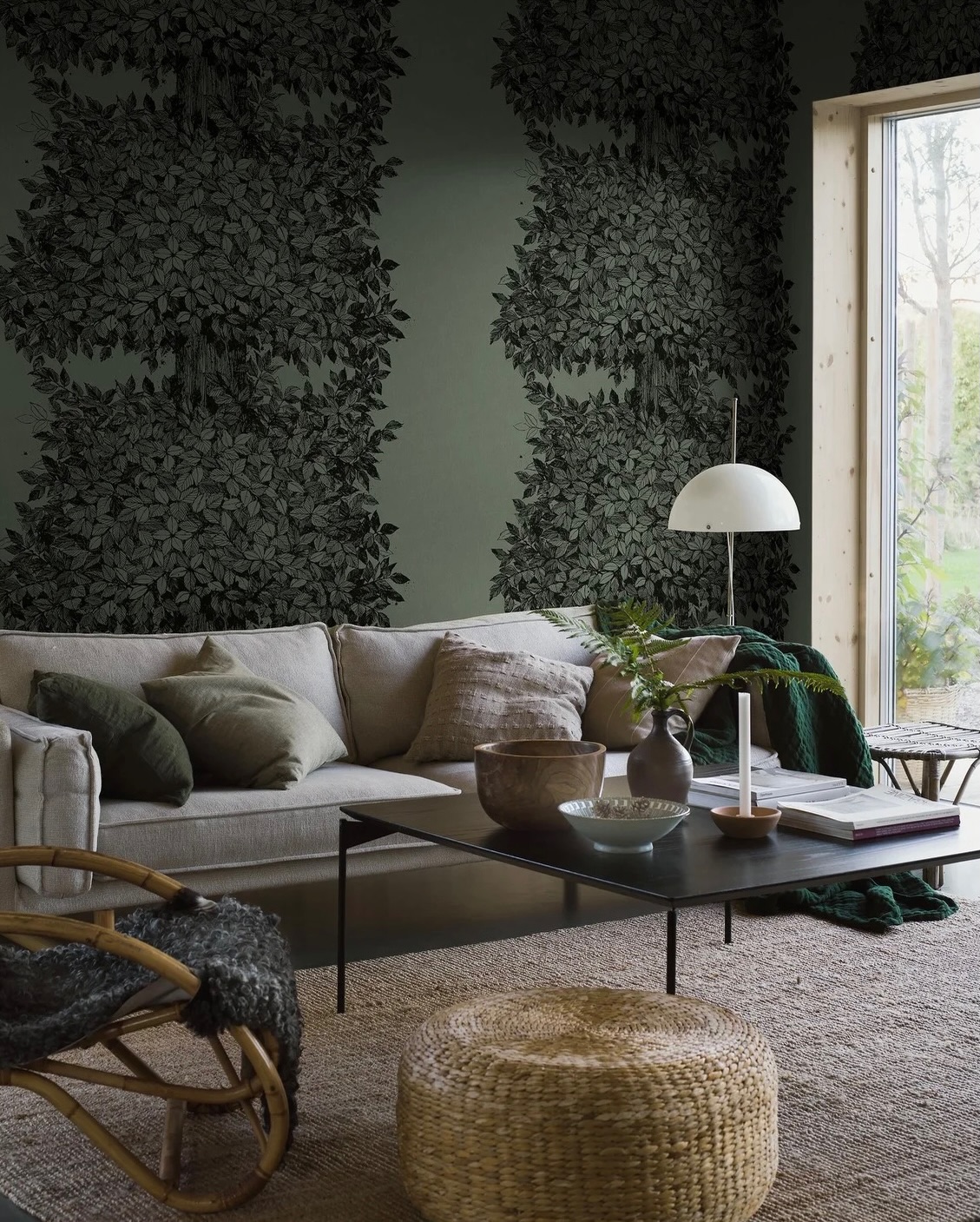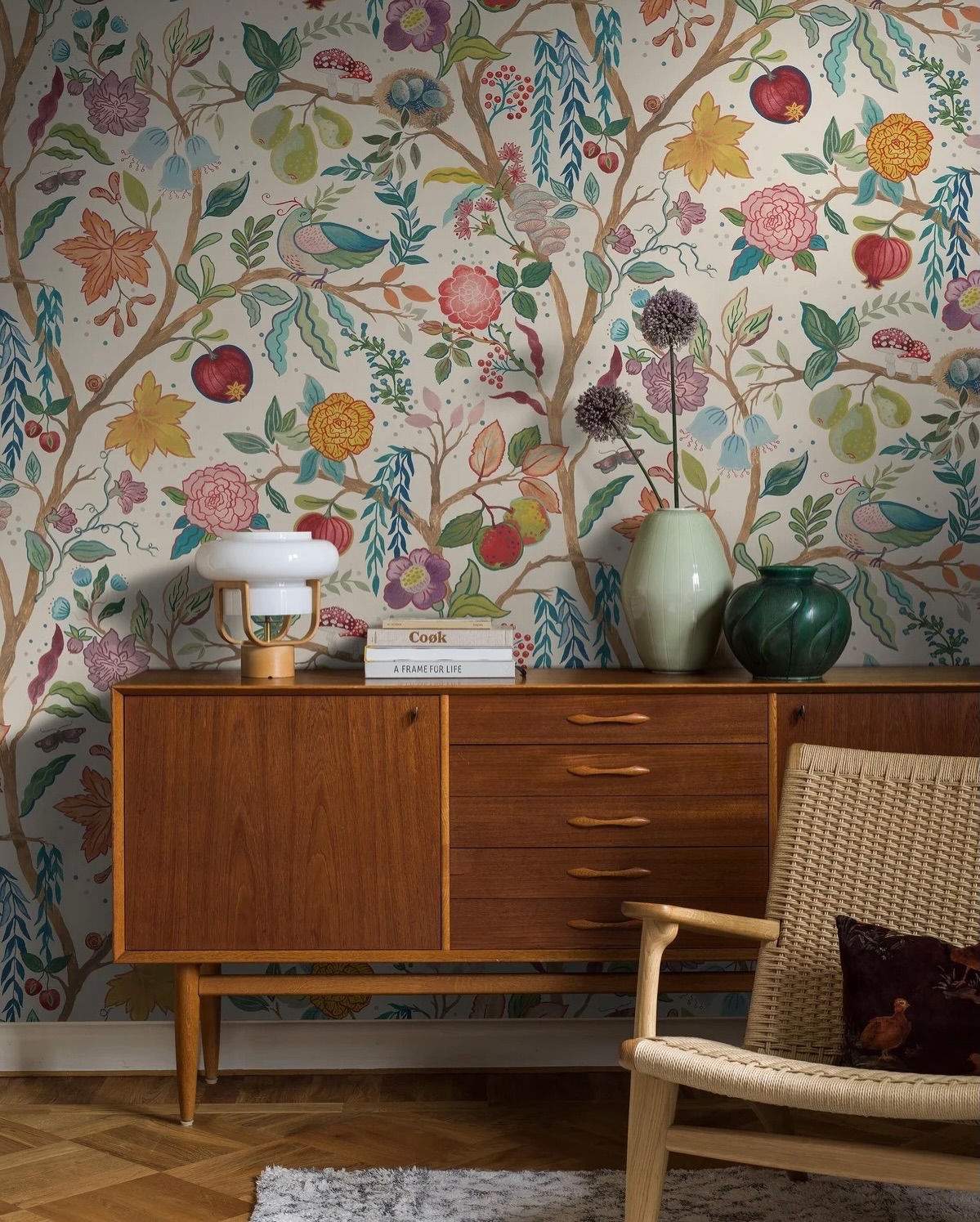 Дизайни від густої, графічної зелені з модерністським характером до легких ботанічних сцен із птахами, вдумливими жабками серед квітів, листям і символічними образами. Є спокійні, приглушені палітри на світлому тлі, а є глибокі, насичені варіанти для інтер’єрів із виразним характером.